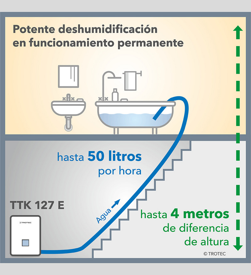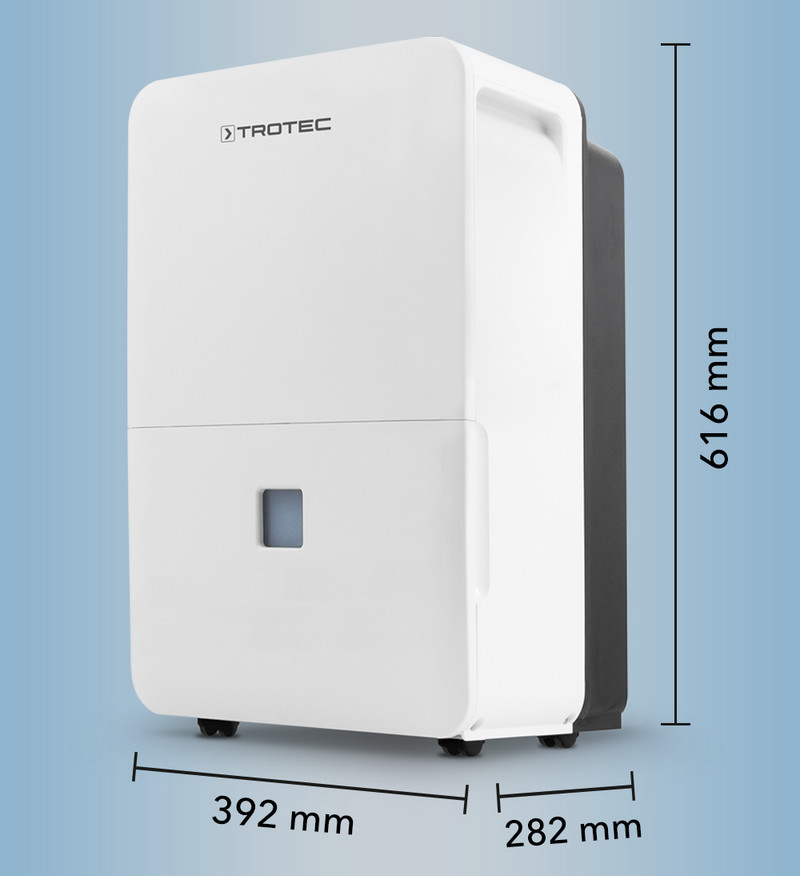 Deshumidificador Trotec, para espacios de hasta 150m2 o 375m3, efectivo y simple, deshumidifica en funcion de la temperatura, capacidad maxima de deshumidificación 50lt / 24H, funcion de reinicio automático, deposito de agua con cacidad para 6lt, temporizador.