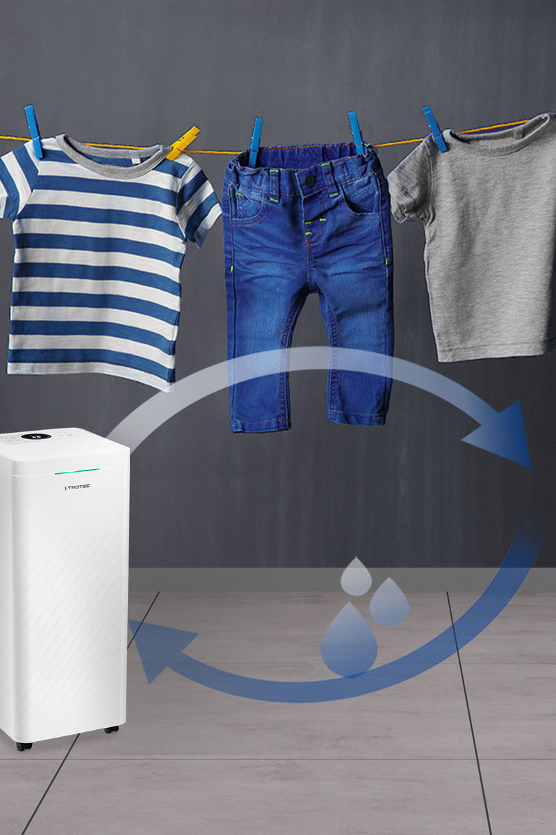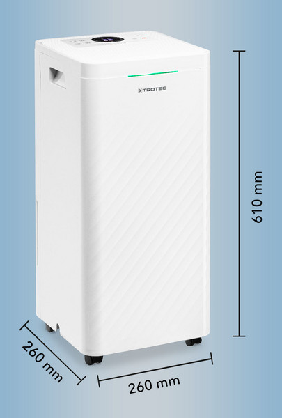 Deshumidificador y purificador Trotec, para espacios de hasta 50 m2 o 125 m3, efectivo y simple, deshumidifica en funcion de la temperatura, capacidad maxima de deshumidificacion 24lt / 24H, funcion de reinicio automatico, deposito de agua con cacidad para 3 lt.