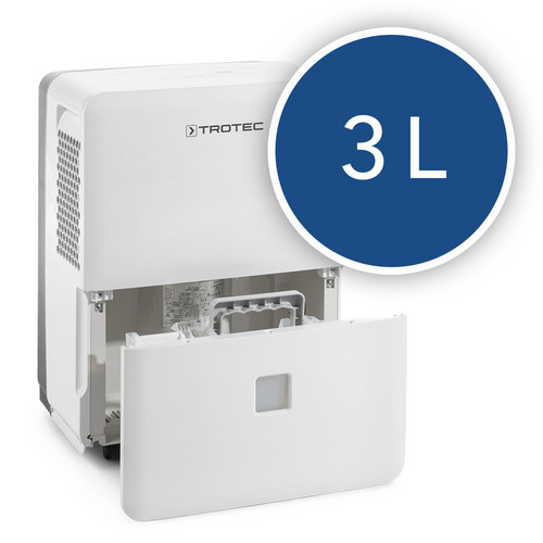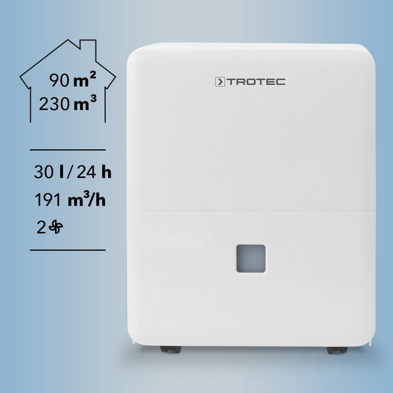 Deshumidificador Trotec, para espacios de hasta 90 m2 o 230 m3, efectivo y simple, deshumidifica en funcion de la temperatura, capacidad maxima de deshumidificación 30lt / 24H, funcion de reinicio automático, deposito de agua con cacidad para 3 lt, temporizador.